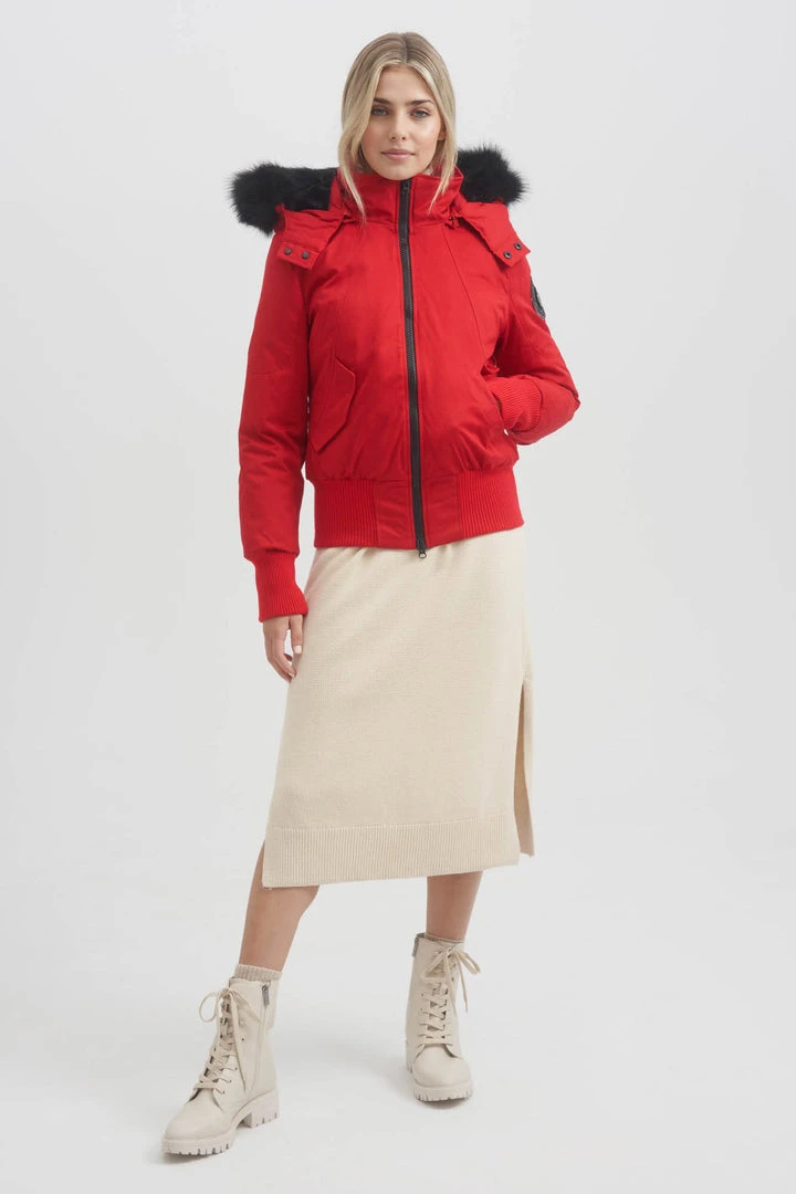 - Detachable hood with faux black fox fur trim